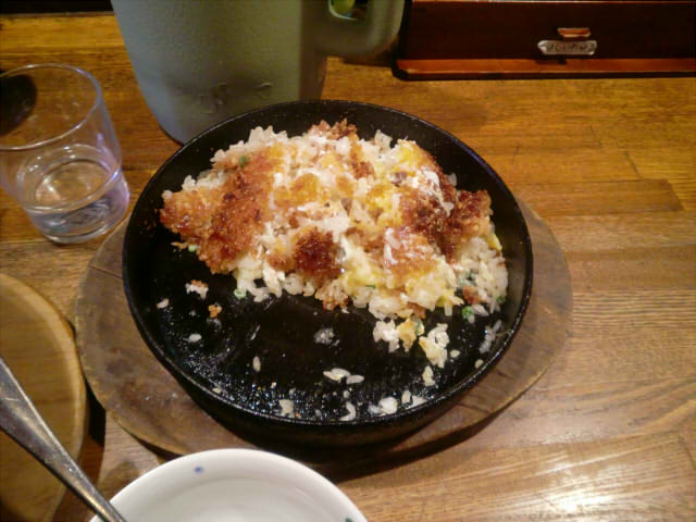 鉄鍋で焼かれたごはんに、生卵をのせて、焼きあがった後まぜて出されます。